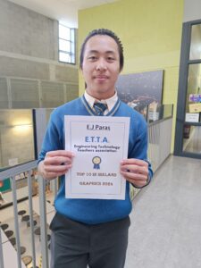 We are delighted to share that EJ Paras has been invited to the Annual National Awards Ceremony in recognition of his outstanding achievement in his Junior Certificate Graphics. EJ has been ranked among the Top 10 Graphics students in the country, a remarkable accomplishment that reflects his dedication and talent. He will be honoured with a Medal and Certificate of Achievement at the prestigious event hosted by the Engineering Technology Teachers’ Association (ETTA) in Galway on Saturday, 22 November 2025.